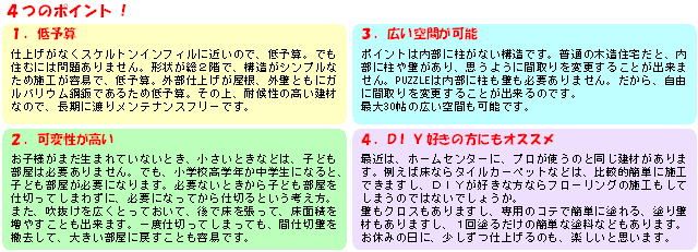 新しいコンセプトの住宅のご提案です。 家を計画する時、間取りやインテリアなど、何をどうするか迷いませんか? 図面を見て、使い方を想像するのは難しいため、出来たものを見て考えたいと思われる方は多いようです。 もし、すぐに住むことが出来、仕上げや間仕切り壁を、後から追加することが出来る家ならば、より希望に近い家を作れるのではないでしょうか。 低予算で新築しておいて、生活しながら、ご家族に合わせてカスタマイズし、一緒に成長出来るのが、PUZZLE~育てる家~です。
