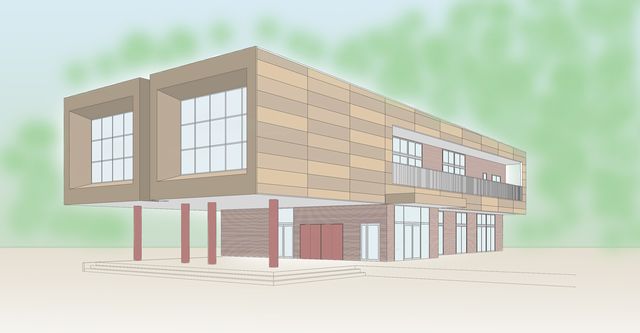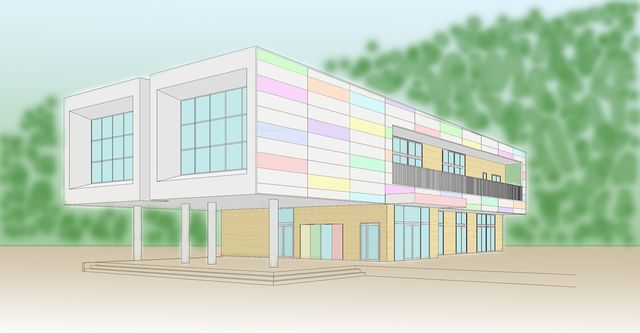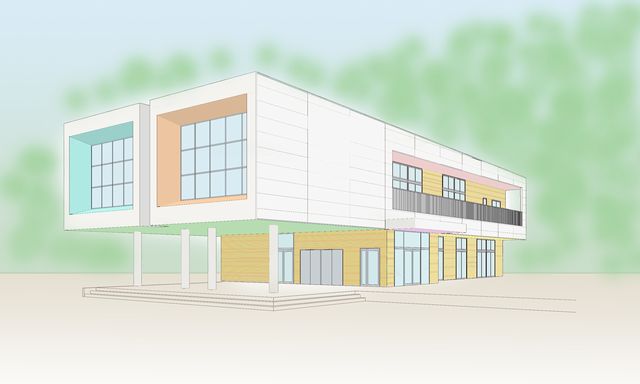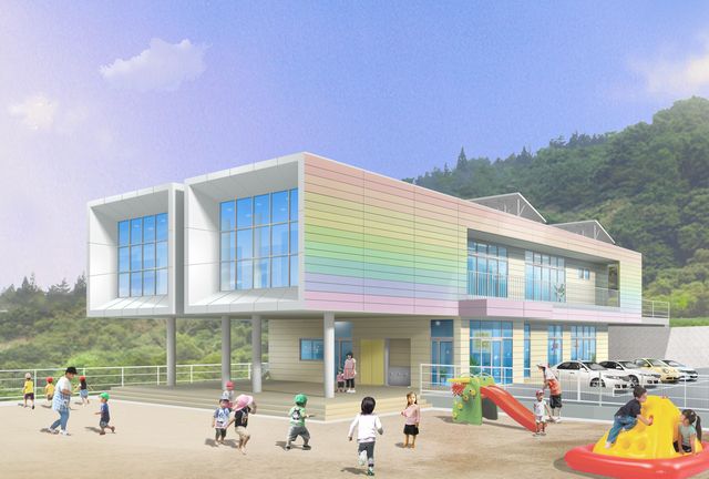 東日本大震災で被災した保育園の再建工事です。実施設計を担当していて、デザインに関して、全て私が考えたというわけではないのですが、簡単なパースでイメージを固めながら、設計を進めました。これは、色彩計画案の一つです。