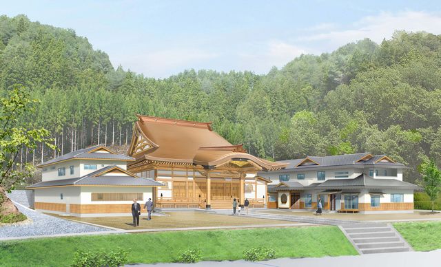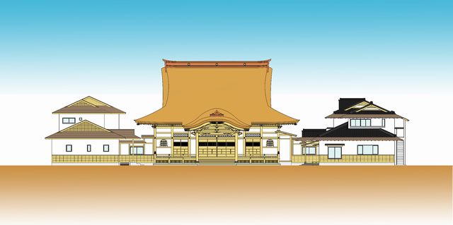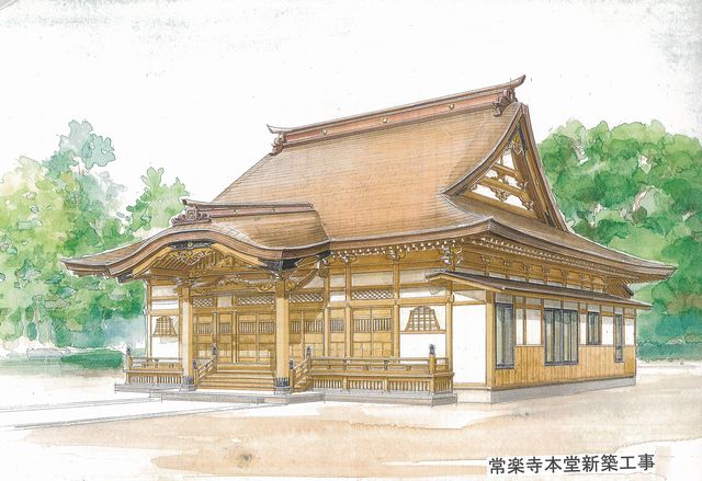 こちらは当所の設計したものではなく、専門の宮大工さんの設計施工です。水彩パースですね。このパースを元に、付属建物(庫裏、会館)の色彩計画を考えました。