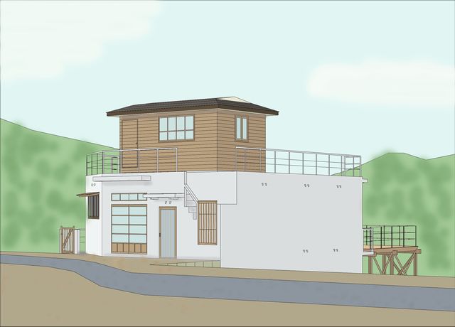 釜石市の橋野にあるセルフビルドで作られた、コンクリートブロック造+木造3階建ての建物の、改修計画です。CADで下絵を書き、フォトショップで着色しました。背景は写真をCADでトレースして、ラフに色付けしました。