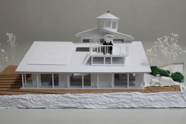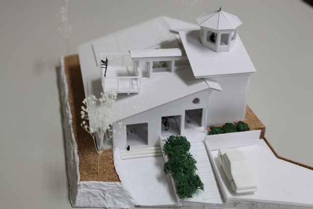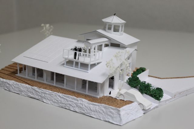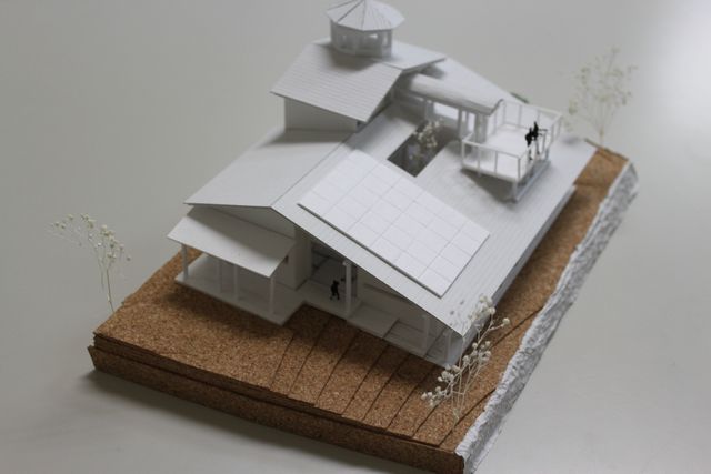 H様邸の計画段階の模型です(実際にはもう少し簡素化されました)。ゆるく傾斜した土地で、その傾斜に合わせて建物を計画しているので、模型としてもちょっと複雑なものになりました。前面の左の開口部と、真ん中あたりの開口部の高さが違うことに注目です。