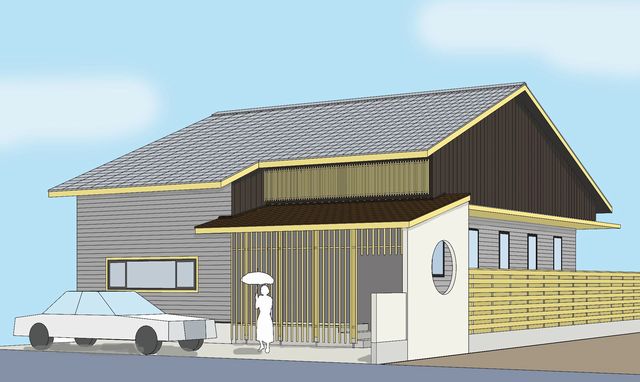 M様邸の外観パースです。 JW_cadの2.5Dという機能で下書きをし、フォトショップで着色しました。 フォトショップはベタ塗が早いので、結構早く描けます。 ムラなどがないため、イラスト風になりますね。 これでも、ある程度、雰囲気は掴んでいただけるのではないかと思います。