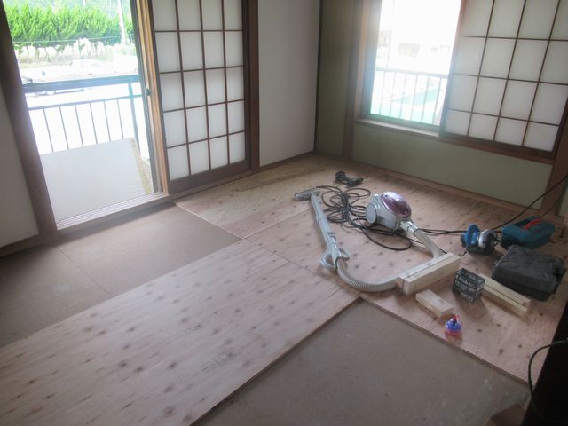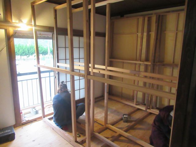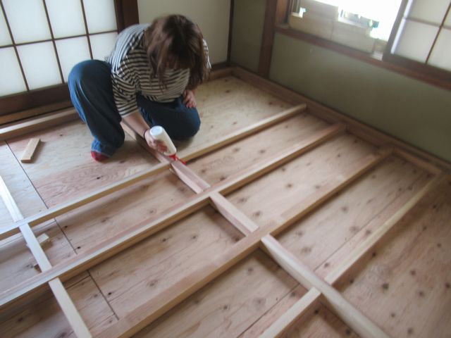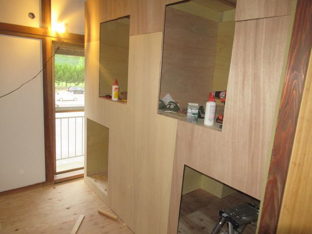 部屋の2/3以上を占める大きさになるので、工程も工夫しています。柱、梁、根太となるフレームを作って、奥の壁に立てかけていき、7つ作ったら、所定の位置にそれぞれ置いて、つなぎを入れます。なお、一番奥のフレームだけ壁となるベニヤを貼っておきます。上部も天井と隙間があまりありません。