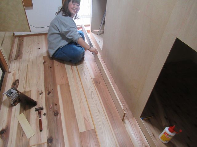次に、残ったわずかな床の部分に、杉の無垢フローリングを貼りました。ホームセンターコメリでB品として販売されていたもので、驚くほど安価でした。もともと畳の部屋でしたが、畳は老朽化していたので処分し、下地のパーティクルボードの上に、ベニヤを貼り、その上にフローリングを貼っています
