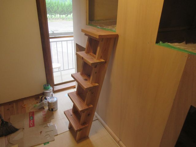 最後に上段にあがるための階段を設置。こちらは150㎜幅で厚さ30㎜の杉材を加工して、木材保護塗料を塗りました。こちらもDIYです