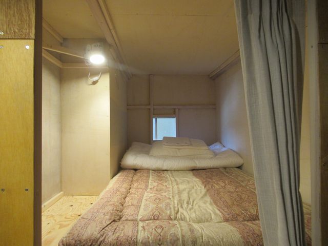 ベッドの内部です。壁、天井は半透明白の木材保護塗料を塗っています。左の空間は荷物やスーツケースが置けるように設計しました。着替えを出し入れするときにベッドの外まで出なくていいように。部屋の幅いっぱいにベッドを作り、両側に布団をしく幅を確保し、残ったスペースを隣のベッド(個室?)と半分ずつ使うようになっています。一泊してみましたが、ドミトリーとしてはかなり快適です