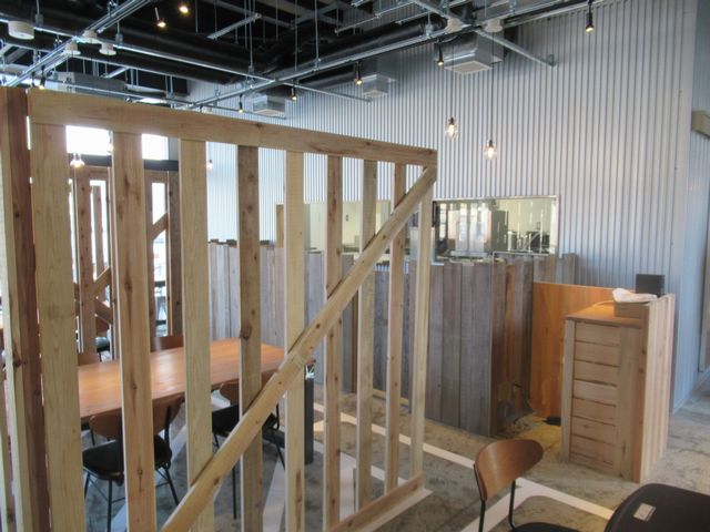 店舗のデザイン案件です。港が見える海沿いの店なので、コンテナ物資の倉庫をイメージしています。市内の材木店にあった古材や、水産物の箱などを使っています。