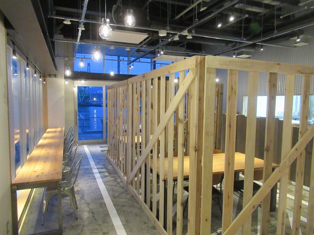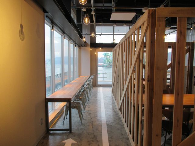 海が見えるカウンター席。右側のブース席に使っているパーテーションは、積み荷の梱包材をイメージしています。