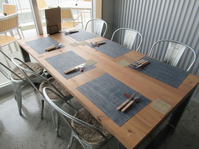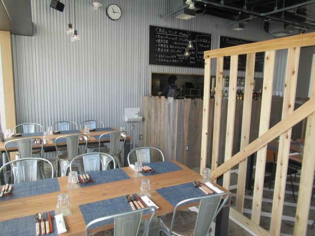 海側の席の様子です。厨房の壁はガルバリウム鋼板素地のスパンドレル張りです。コンテナの壁をイメージしています。