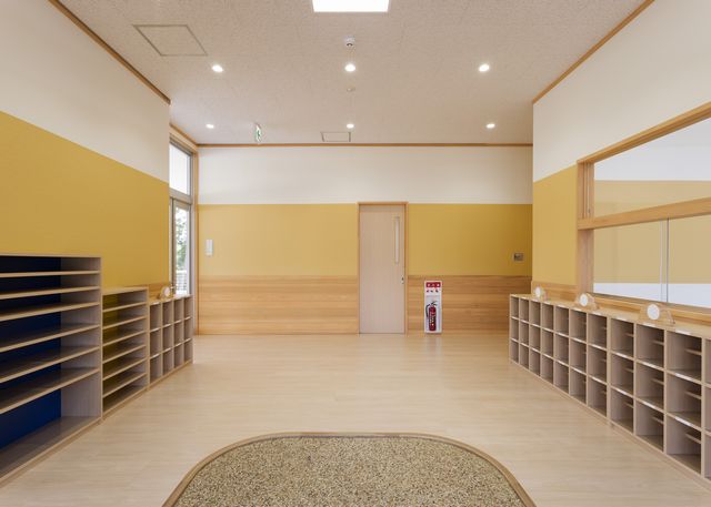 1階の2歳児保育室兼ほふく室です。家具をパーテーションとして、保育室とほふく室のエリアを分けています。写真ではあまりわかりませんが、家具の中の背板だけが、原色に近いオレンジ色になっています。隣の建具との色相の関係など、一つの部屋で、バランスよく配色するように心がけました。左の窓は屋外のテラスに面した掃出し窓ですが、小さい子どもが出ていかないように、木製の柵がついています。