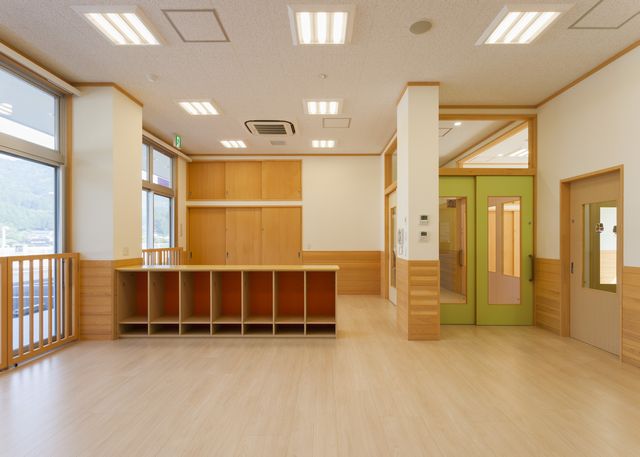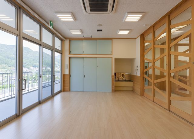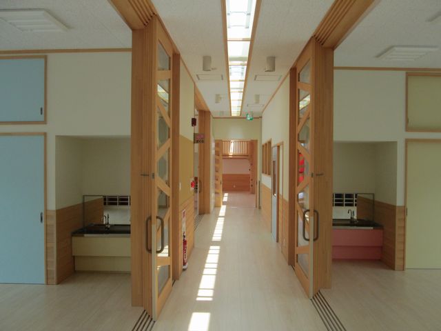 上の写真の左側の部屋、4歳児保育室です。窓はすべて広いバルコニーに面していて明るく、開けば広い、半屋外の部屋として使うことも出来ます。廊下に面した建具も、森の木をイメージしたデザインで、こちらも広く開けることができます。