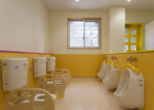 1階のトイレです。2歳児までのトイレなので、ご覧のようにとても小さいです。象の形の仕切り板は、手すりとペーパーホルダーも兼ねています。