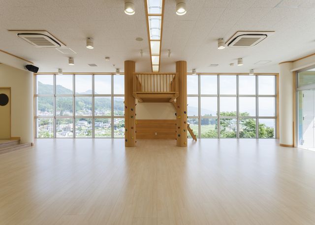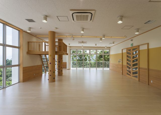2階の遊戯室。この部屋が、外から見た「双眼鏡」のレンズにあたる窓がある部屋です。 窓の間に砦があるのですが、これは建物の構造体である柱を使って作られています。 柱には色とりどりのクライミングホールドついていて、木登り柱と呼んでいます。 入り口の建具のデザインは、正面の窓にも見えますが、周囲を取り囲む森をイメージしています。