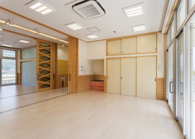 廊下の写真の右側の部屋、5歳児保育室です。向かいの4歳児保育室も、すべて建具を開けた状態です。このようにオープンスクール形式として使うことが出来ます。右側はやはり広いバルコニーになっています。