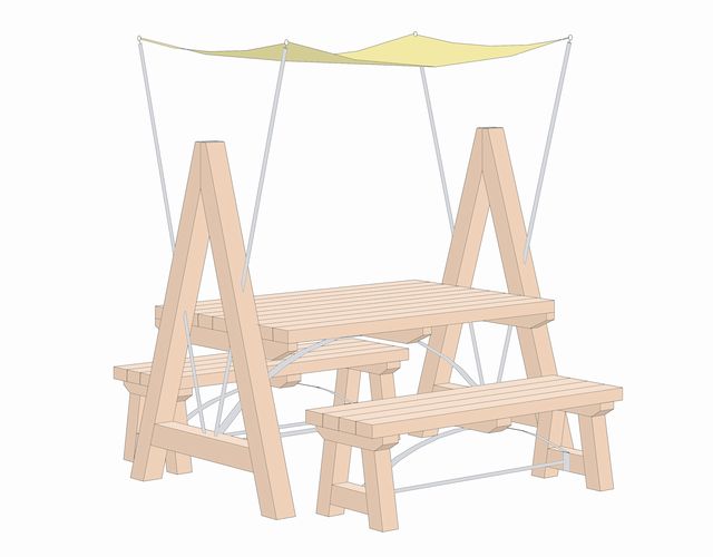 上記のデザイン画を提出すると、日よけの傘を設置できるようにしたいという、追加のご希望があり、こちらも悩んだ挙句、テーブルの脚でもあり、さらに上まで飛び出している材に、穴をあけて、スチール製のポールを斜めに差し込み、そこに日よけの布を縛るという方法を思いつきました。こうすると、風が強くてもポールが抜けたりすることがありません。脱着も可能です。
