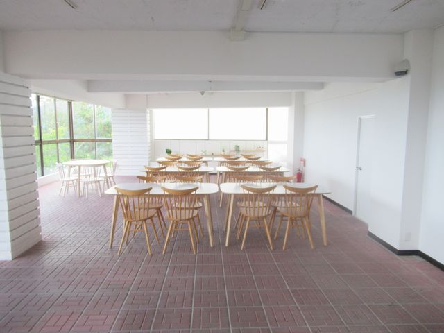 休憩及びイベントスペース。天井を撤去し梁を露出させて、天井を高く、RC造であることを強調しています。天井には配線レールを設置し、スポットライトをつけています。テーブルとチェアも含め、ほとんど白または白木で統一されています。そのため以前よりも明るく感じるようになりました。