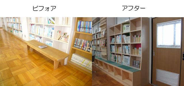 低いベンチが1つだけあって、いつも席が一杯でした。本棚を改造し、一番下の段を前に出し、座ったり、上に登って高いところにある本を取れるようにしました。(「のぼりまショカすわりまショカ」意匠登録済)