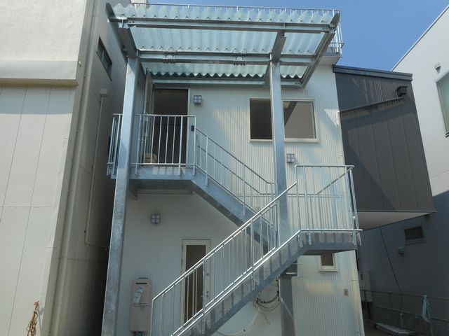 最初の写真の反対側です。2階の住居部分へは外部階段でアプローチするようになっています。屋根をつけていますが、南側なので光が入るように透明なポリカポネートの折板を使用しています。階段も溶融亜鉛メッキの素地としています。