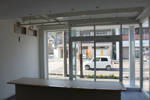 事務所内部から道路側を見たところです。来客スペースは天井が高くなっていて、デッキプレートや配管が露出する、スケルトンデザインになっています。こちらも鉄骨造であることが一目でわかるようにという意図もあってスケルトンとしています。