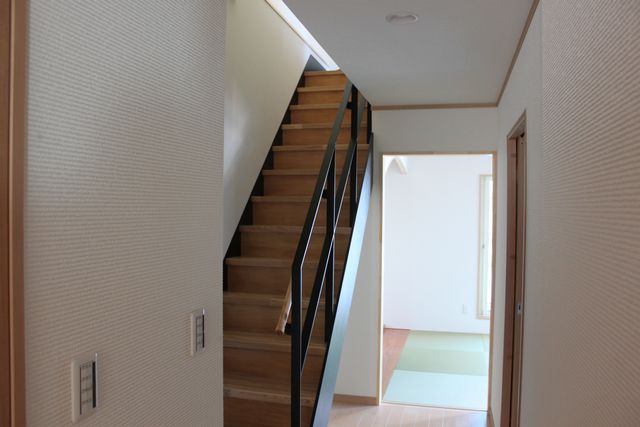 2階の廊下と3階へ上がる階段。こちらもスチール製の手摺ですが、木と組み合わせて、冷たい感じにならないようにしています。