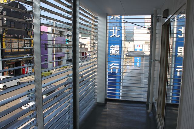 2階の道路に面するバルコニーです。スチール製のルーバーを目隠しにしています。