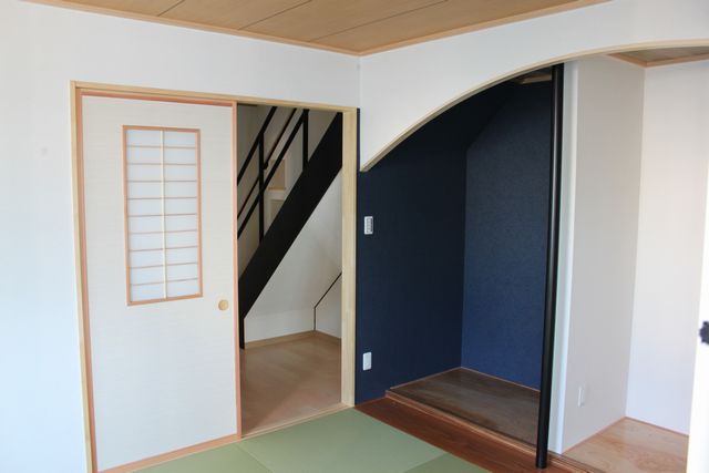 和室の床の間です。床柱は実はスチールです。ややトリッキーな床の間と言えるかも。漆のように見えなくもないかなと思っていますが、いかがでしょうか。ちなみに上り框にはゼブラウッドを使用しています。畳は正方形の琉球畳です。