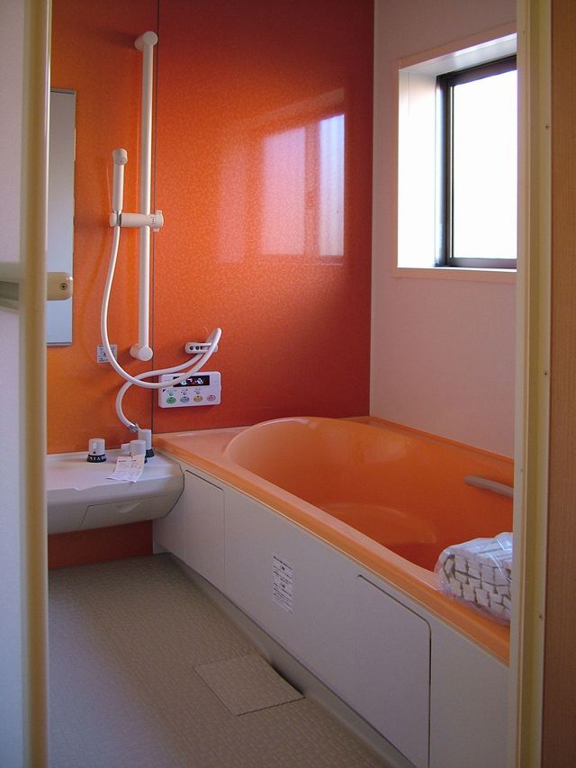 ユニットバスですが、ちょっと思い切った色を選びました。パッションカラーですね。正面のアクセントカラーの壁は、実は、左に行くに従って、黄色になり、グラデーションになっています。