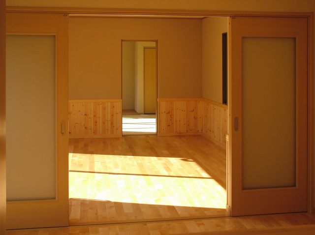 ダイニングキッチンとリビングは、両引き戸でつながっていて、一体的な雰囲気にもなります。その奥には寝室があります。床は無垢のカバフローリング、腰壁は無垢のパイン材です。