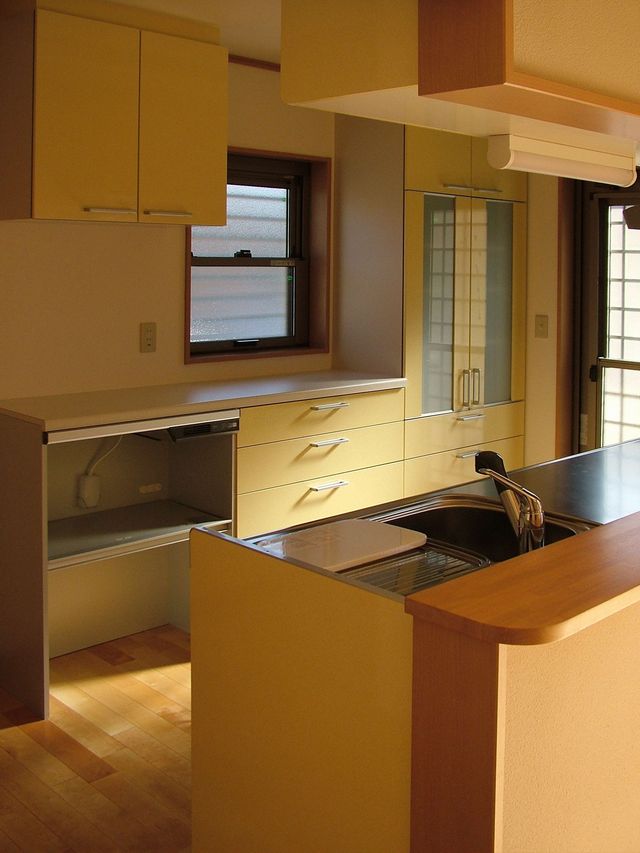 キッチンは対面式としていますが、腰壁を設置して、リーズナブルなI型キッチンとしています。周囲の雰囲気に合わせて、薄めの黄色を選んでいます。