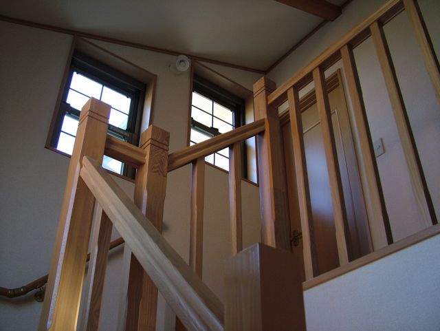 階段室は吹き抜けになっています。手摺も格子のオープンなタイプとして、2階と1階の一体感が持てるようにしました。