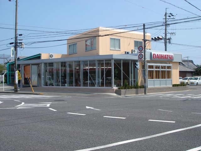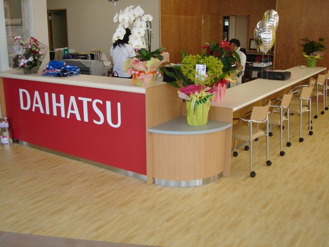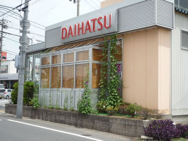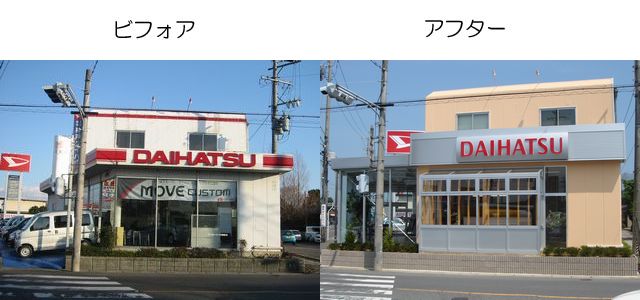 自動車販売店の改修工事です。看板を取替え、外壁を塗替え、サンルームを設置、左側のショールームを増築しました。植込みのブロックもリニューアルしました。