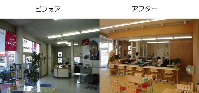 内部のビフォア・アフターです。木の色を基調にして、温かみのあるインテリアとしました。事務所スペースとショールームスペースを分けるように、カウンターと垂れ壁も設置しています。