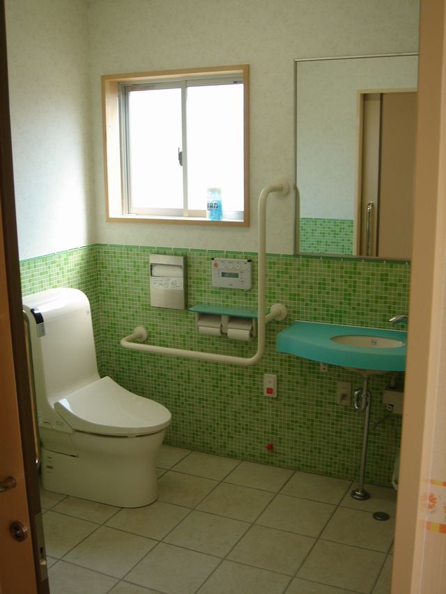 車椅子や身障者の方でも使える多目的トイレ。ガラスタイルを使用しています。カウンターや紙巻器の上の棚も、半透明のものを使用しています。