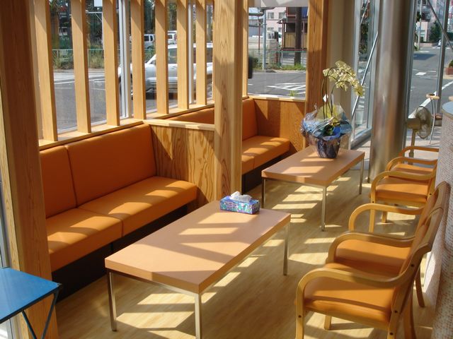 サンルーム部分の待合スペースです。アルミのサンルームの手前に木のルーバーをつけて、日射を軽減しています。