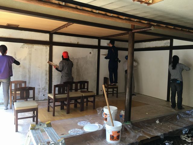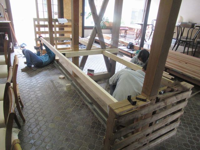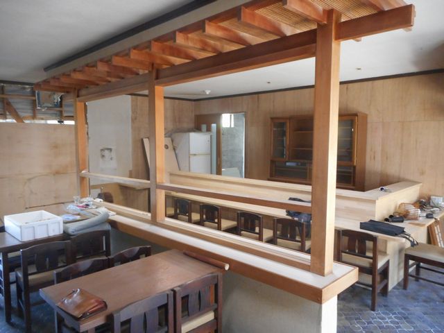 ここからは途中の様子です。小上がり部分は、ボランティアを募集し、DIY体験ということで、しっくい塗りを手伝っていただきました。体験したい人は意外に多く、完成するとお店に来てくれたりするので、大変助かりました