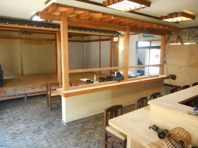 こちらもビフォアの様子。このようにいかにも和風のしつらえでした。壁面に関しては、ほとんどの部分に色を塗ることで雰囲気を替えました。床と天井はそのままです。床のタイルはなかなか凝っていて、積極的に残したいと思うものでした