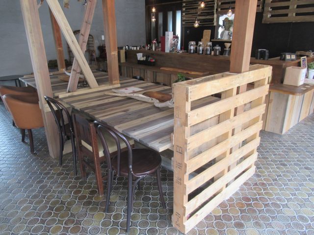 1枚目の写真のカウンターの後ろにも使っていますが、ローパーテーションにも使用済みのパレットを使っています。近くにある工場からもらいました。作りながら考え、手に入った廃材などを使えるのは、DIYを織り交ぜるメリットです。設計だけして、工事業者に発注する従来のスタイルだと、廃材を使うのはハードルが高いです