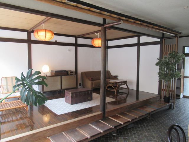 こちらも同じように、和モダンをイメージしたインテリアです。家具は共同代表の神脇隼人がリサイクルショップで買い集めたもの。照明器具はもともとあった、白い和紙のセードに、木工用のワックスを塗ってみました。これも思い付きです。床や壁、柱なども塗装することで、イメージを替えました